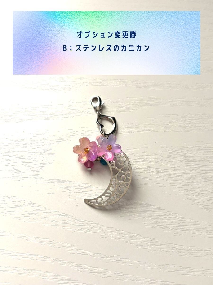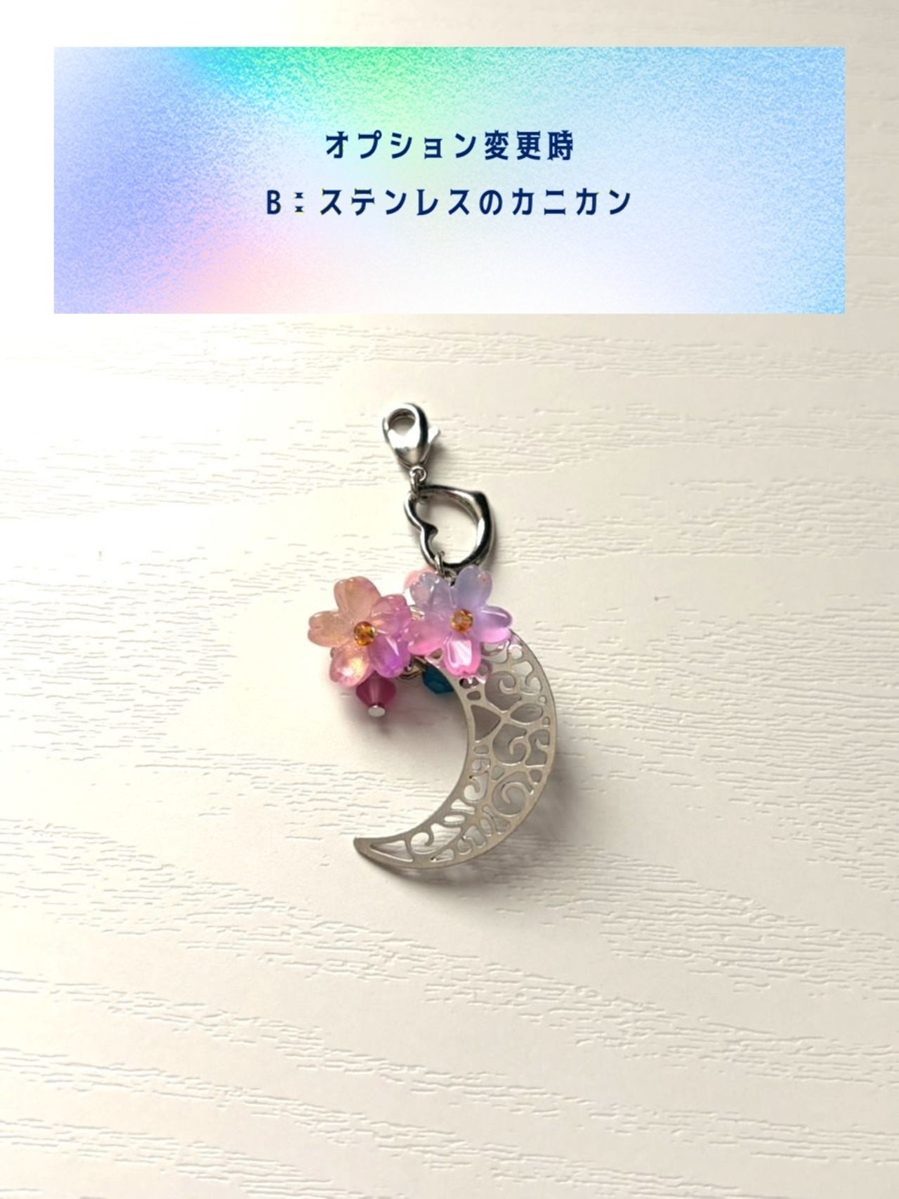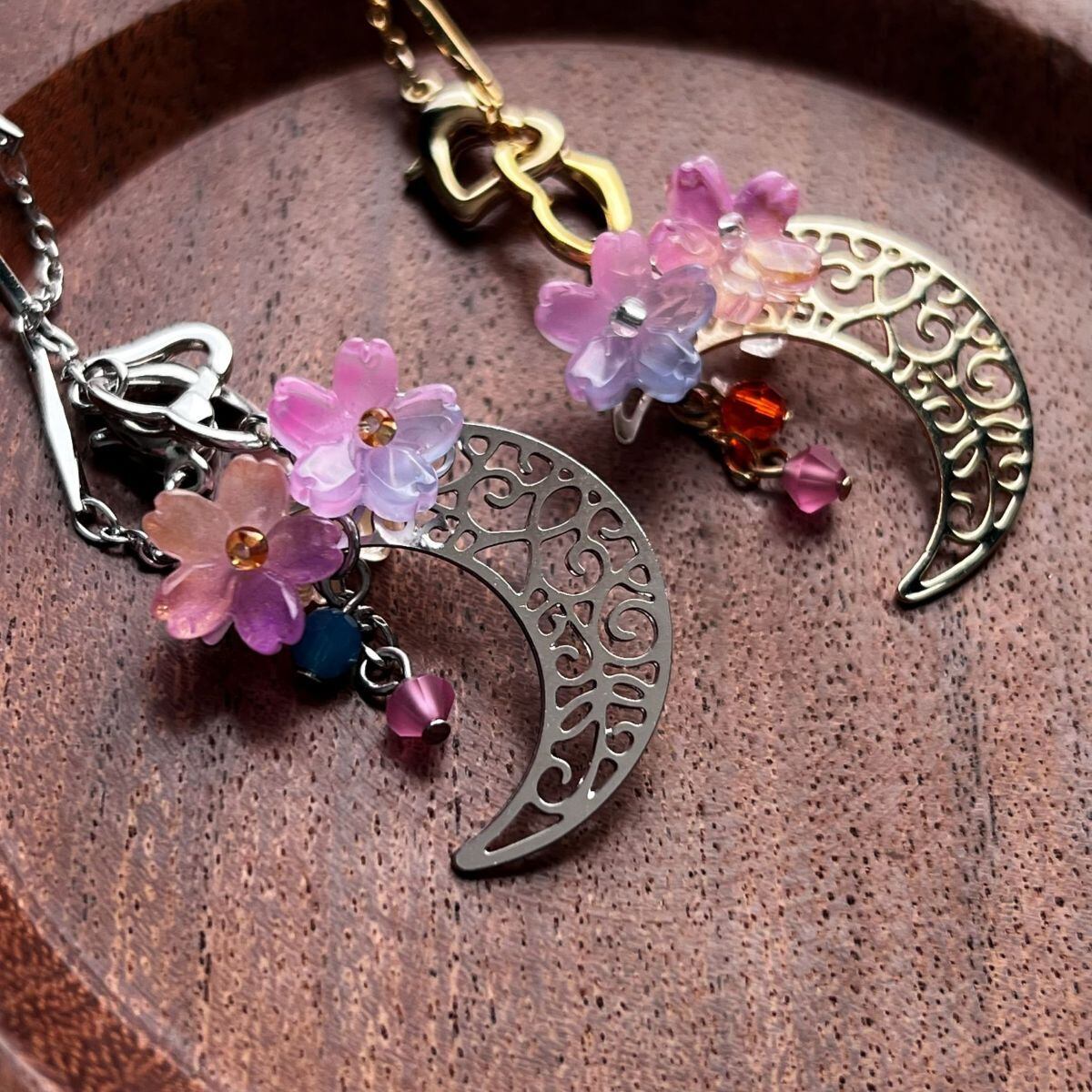 月の中で輝くクリスタルビーズはゴールドには赤の強いオレンジ×ローズピンクのビーズを、シルバーにはカリビアンブルー×ローズピンクのビーズを使用しています。