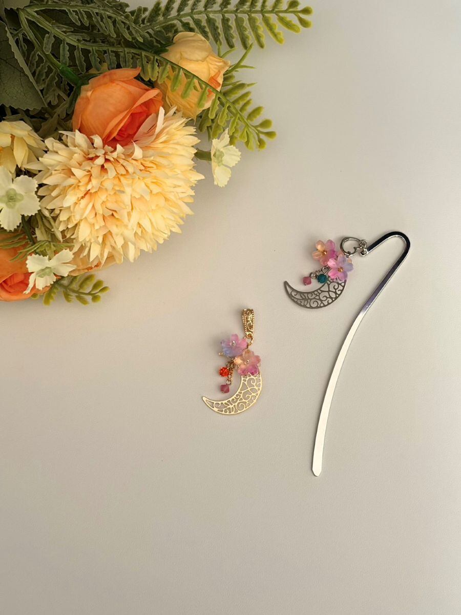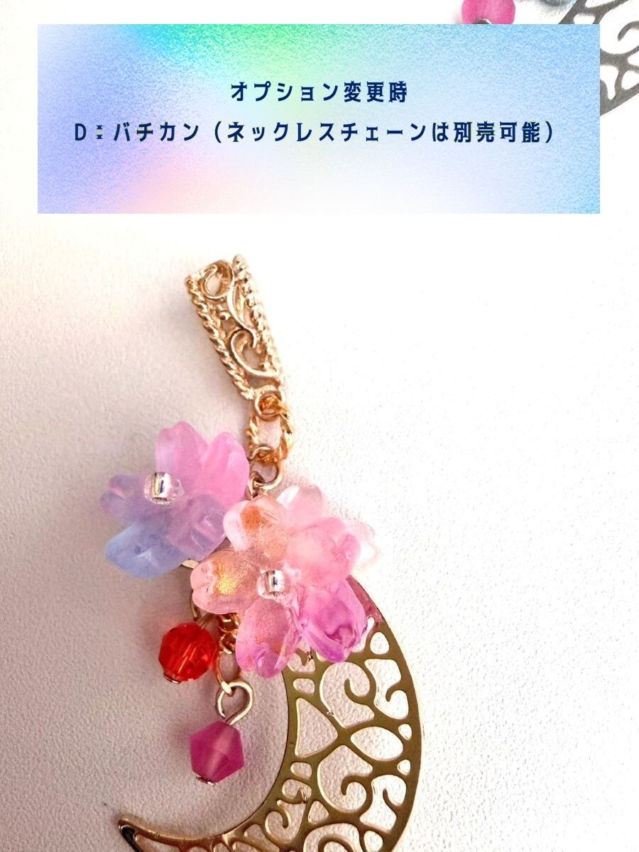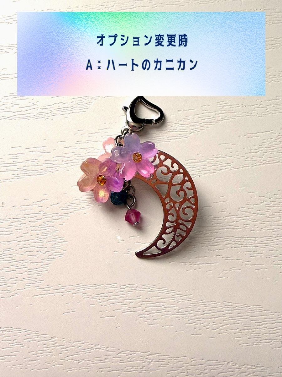 月の中で輝くクリスタルビーズはゴールドには赤の強いオレンジ×ローズピンクのビーズを、シルバーにはカリビアンブルー×ローズピンクのビーズを使用しています。
