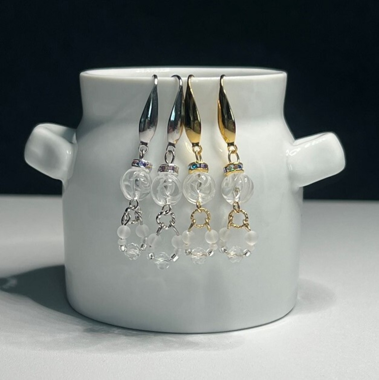 自分のピアスを作る作業をはじめてから、かわいいと言ってもらえることがとても多かったピアスを石を変えて作りました。