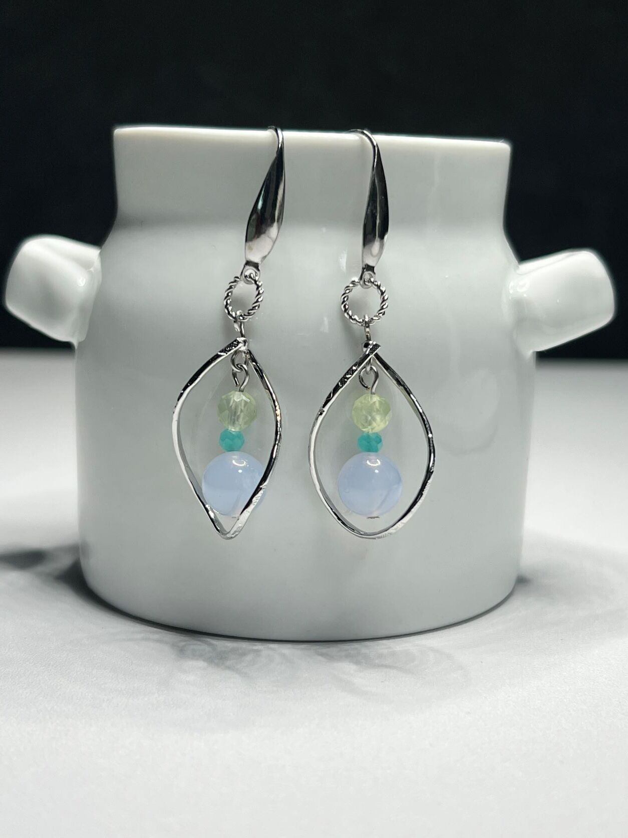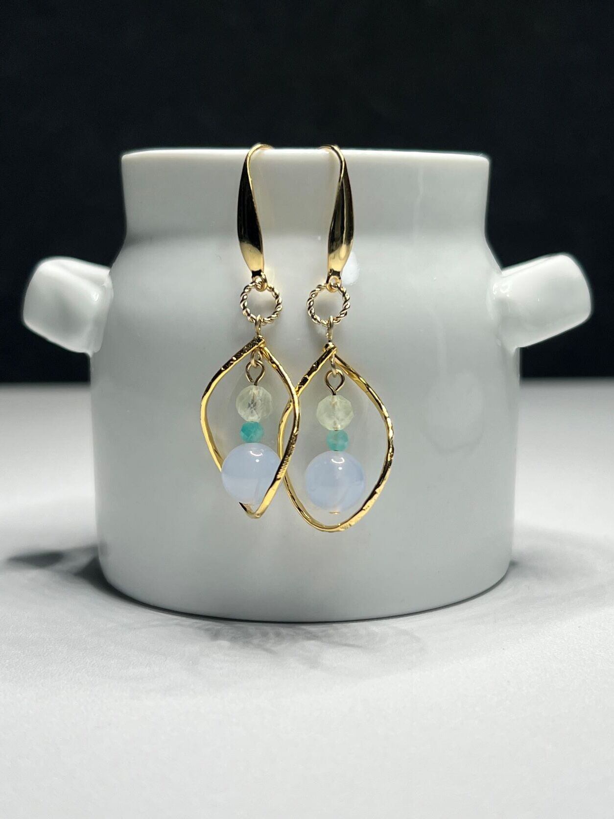 天然色のブルーカルセドニー、プレナイト、アマゾナイトシリカのピアスです。