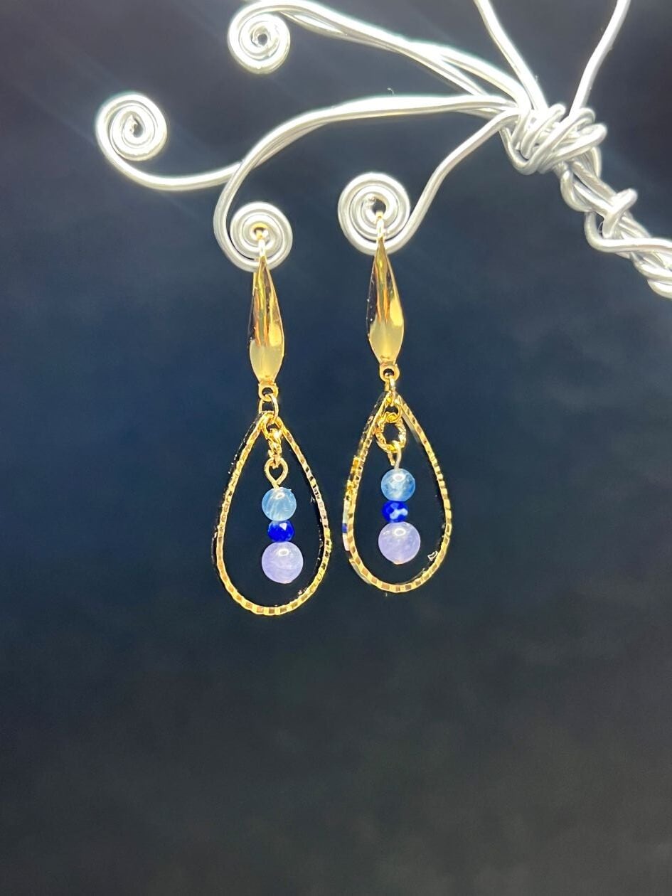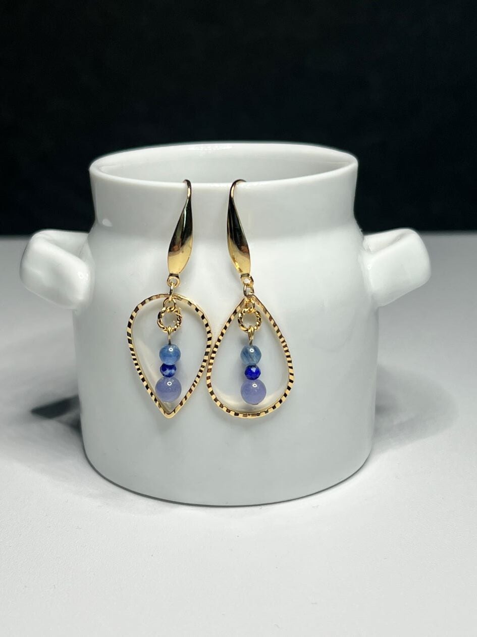 カイヤナイト・タンザナイト・ラピスラズリを使用したしずくのピアスです。
